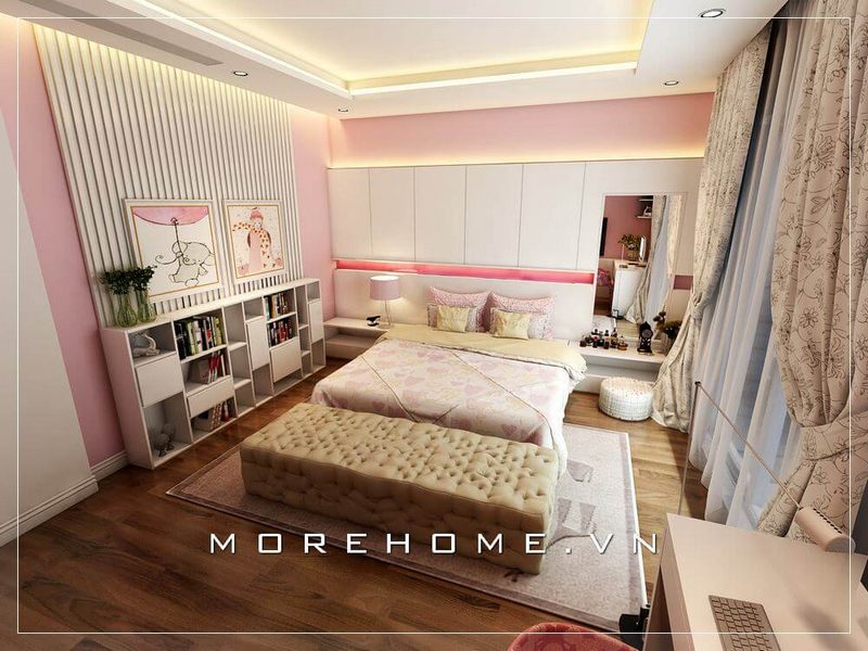Nội thất phòng ngủ gỗ công nghiệp ấn tượng với 2 gam màu trắng - hồng chủ đạo, đây là xu hướng được nhiều bạn nữ lựa chọn nhiều trong vài năm trở lại đây