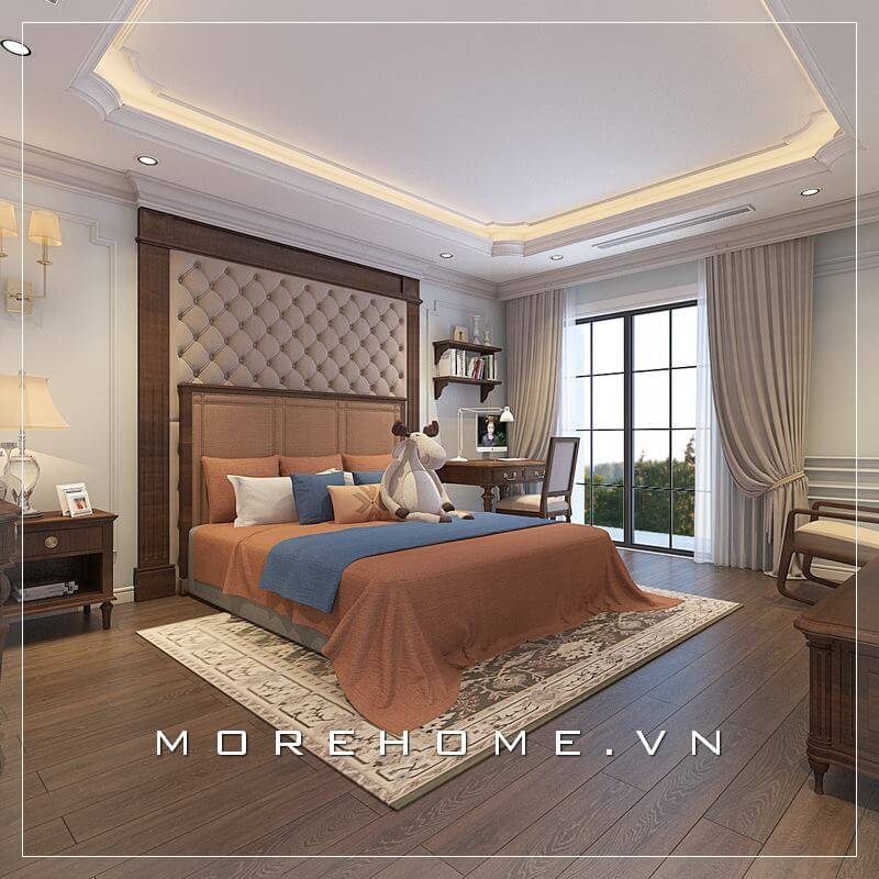 Phòng ngủ biệt thự ở phòng ngủ Master đẳng cấp và sang trọng, nội thất gỗ óc chó với đường vân độc đáo, lạ mắt trở thành điểm nhấn nổi bật trong mẫu thiết kế này