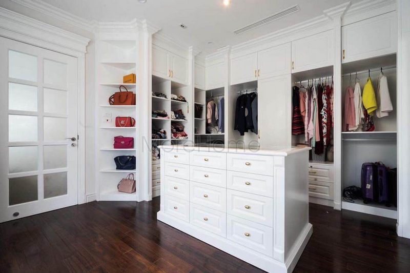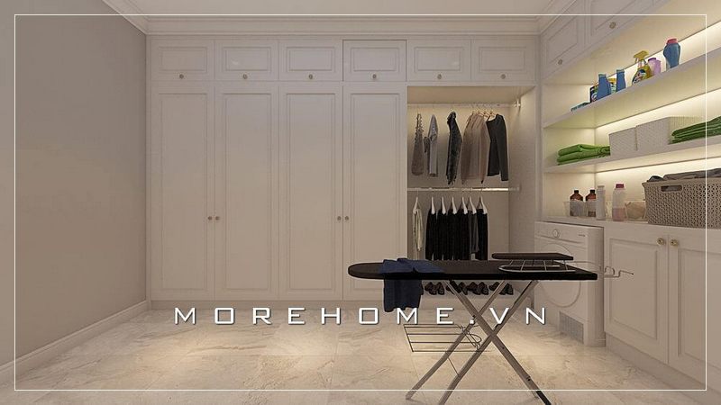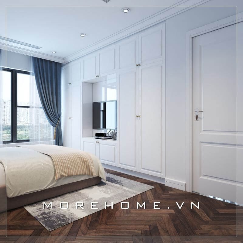 Nhằm khai thác hết các diện tích căn phòng thì thiết kế tủ quần áo tân cổ điển âm tường kịch trần màu trắng đã làm tăng độ tiện nghi và sự sắp xếp nội thất rất khoa học của KTS Morehome.