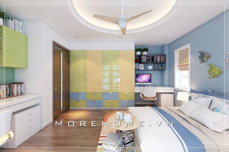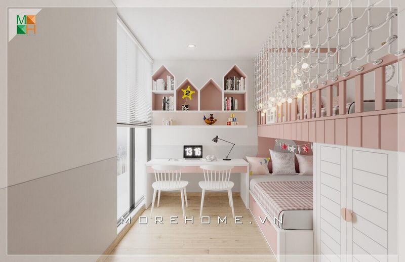 Bàn học của con được thiết kế hiện đại đặt ngay cạnh cửa sổ, giá sách treo ngay trên bàn học, giúp trí tưởng tượng bay cao, giúp bé có tư duy tốt hơn.