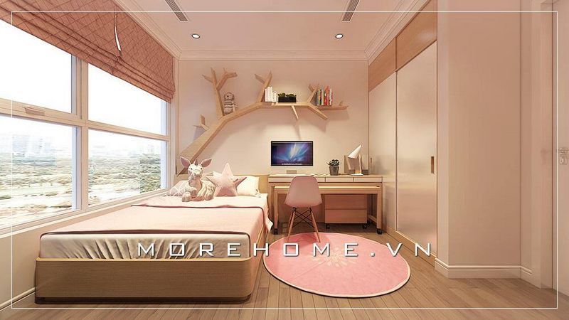 bàn làm việc gỗ công nghiệp hiện đại được thiết kế ngay tại khu vực cửa sổ căn phòng giúp con sử dụng được thêm ánh sáng tự nhiên và tập tập hơn trong không gian học tập