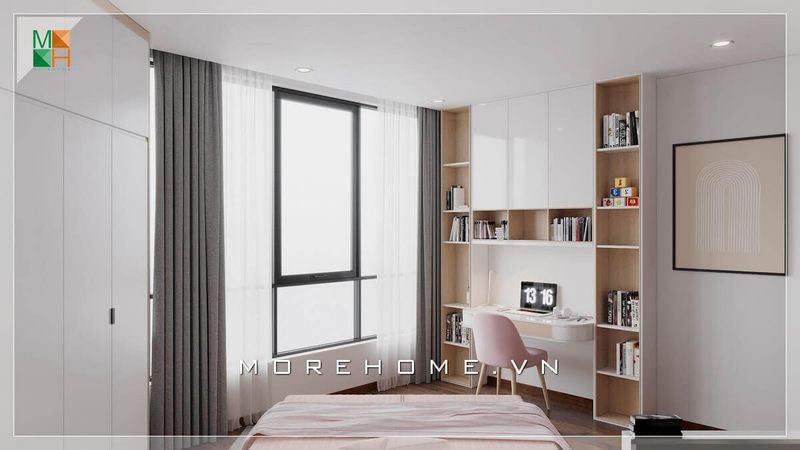 Mẫu phòng ngủ tông màu trắng trẻ trung, với bàn học kết hợp cùng giá sách giúp tiết kiệm diện tích sử dụng, cửa sổ lớn với rèm che màu xám tạo điểm nhấn và làm cho căn phòng trở nên rộng rãi và thoáng mát hơn