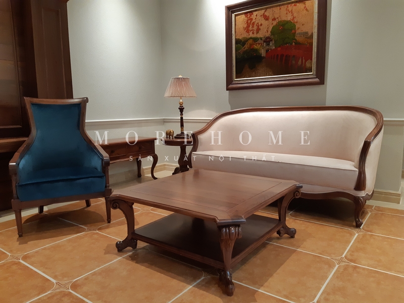Thi công sofa đơn khung gỗ óc chó bọc nỉ màu xanh coban tân cổ điển đường cong mềm mại tạo sự cao cấp, thẩm mỹ cho không gian