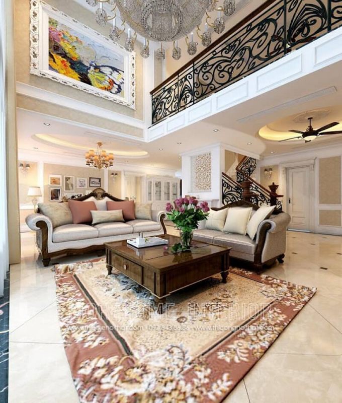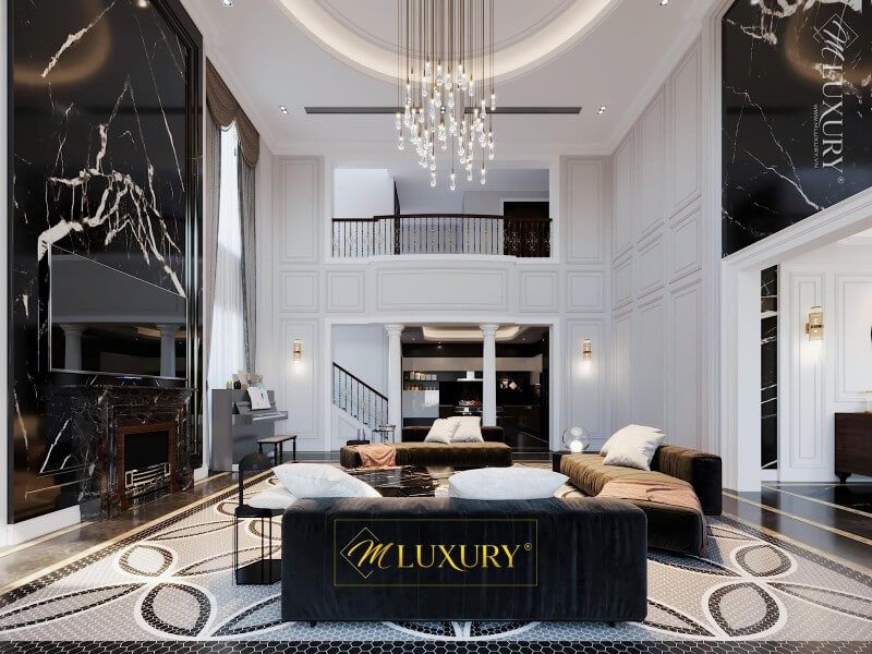 Sắp xếp nội thất phòng khách thông tầng biệt thự cao cấp tại Vinhomes Imperia Hải Phòng.