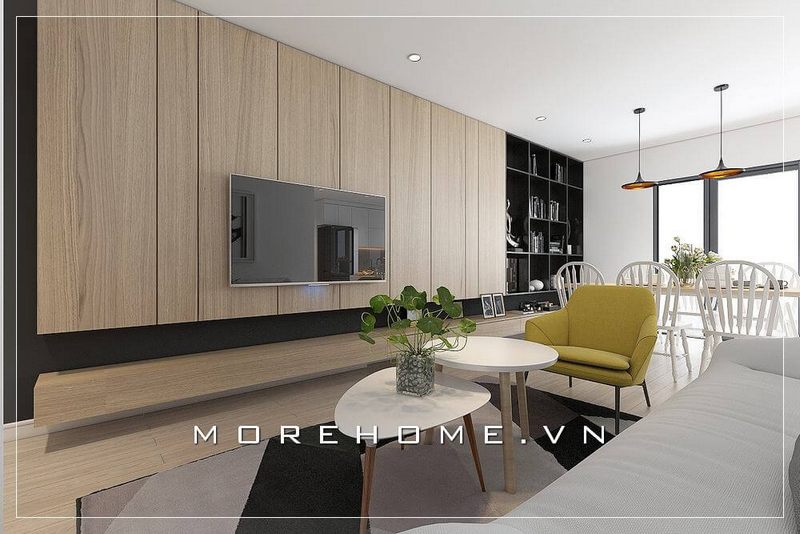 Mẫu thiết kế phòng khách chung cư cao cấp sử dụng nội thất gỗ công nghiệp An Cường mang vẻ đẹp trẻ trung, tiện nghi