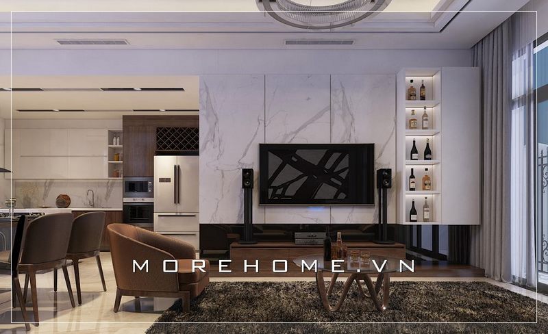 Mẫu thiết kế phòng khách căn hộ đẹp kết hợp nội thất tân cổ điển với đường nét tinh tế mang đến vẻ đẹp sang trọng đẳng cấp