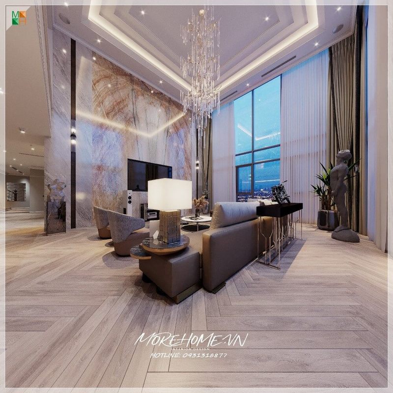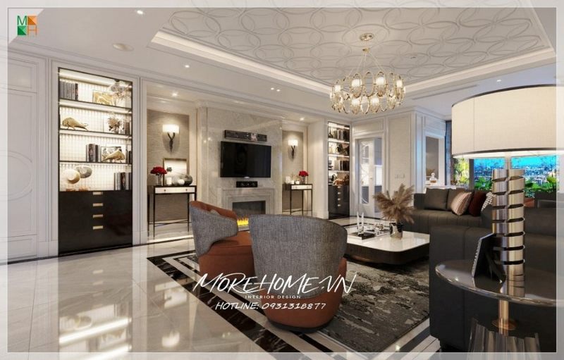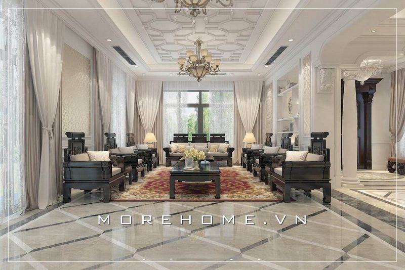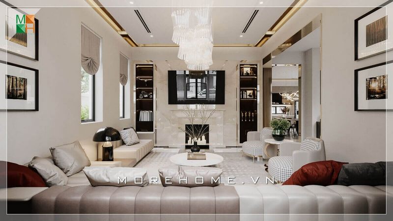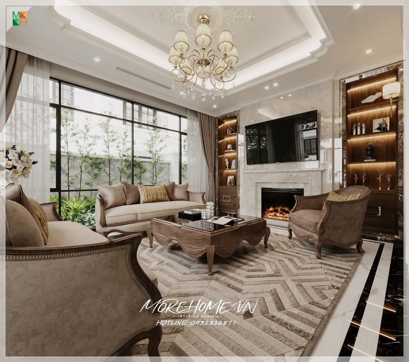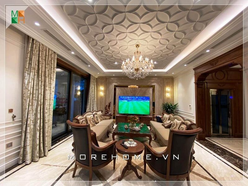 Hình ảnh phòng khách biệt thự tân cổ điển thực tế được thi công hoàn thiện bởi công ty nội thất Morehome
