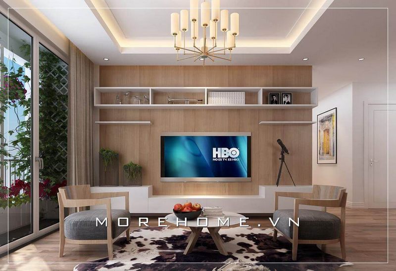Gỗ trang trí tường tạo điểm nhấn ấn tượng cho phòng khách hiện đại căn hộ chung cư.