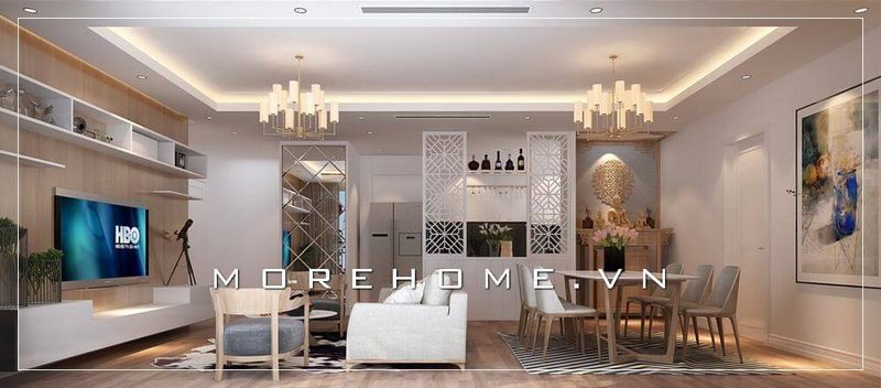 Bài trí bàn thờ phật trong phòng khách căn hộ đương đại hợp phong thủy.