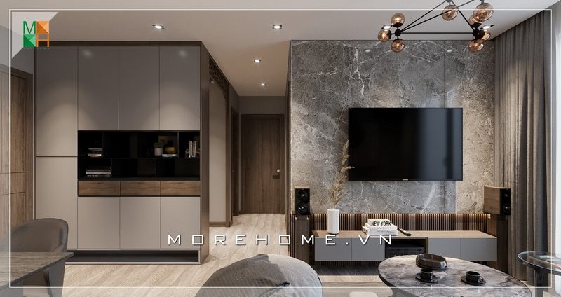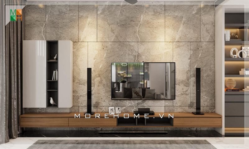 Tường treo tivi ở phòng khách của căn hộ chung cư hiện đại đầy ấn tượng với đá ốp xám tinh tế, tự nhiên đem đến những cảm giác mới lạ thu hút.
