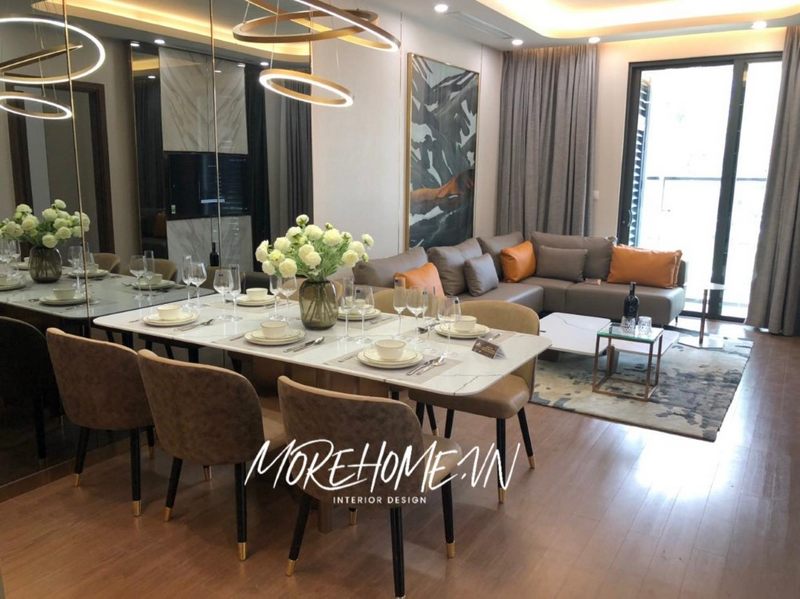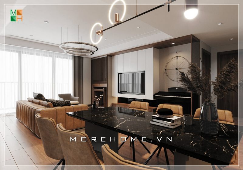 Tận dụng khoảng không gian trống giữa phòng khách và lối vào để đặt một bộ bàn ăn cũng là một phương án hết sức sáng tạo của KTS Morehome, giúp không gian đỡ trống trải và cũng tạo nên bố cục ấm áp cho ngôi nhà của bạn