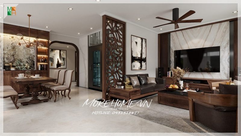 Giới thiệu mẫu thi công thiết kế phòng khách gỗ óc chó biệt thự, nhà phố, chung cư cao cấp tân cổ điển sang trọng.