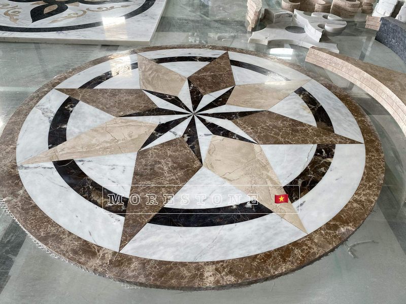 Mẫu đá lát nền trang trí nơi sảnh chờ, phòng khách rộng,.... thiết kế hình tròn với những kết hợp họa tiết phối 3D độc đáo, sẽ là điểm nhấn ấn tượng nếu được sử dụng ở bất kì đâu.