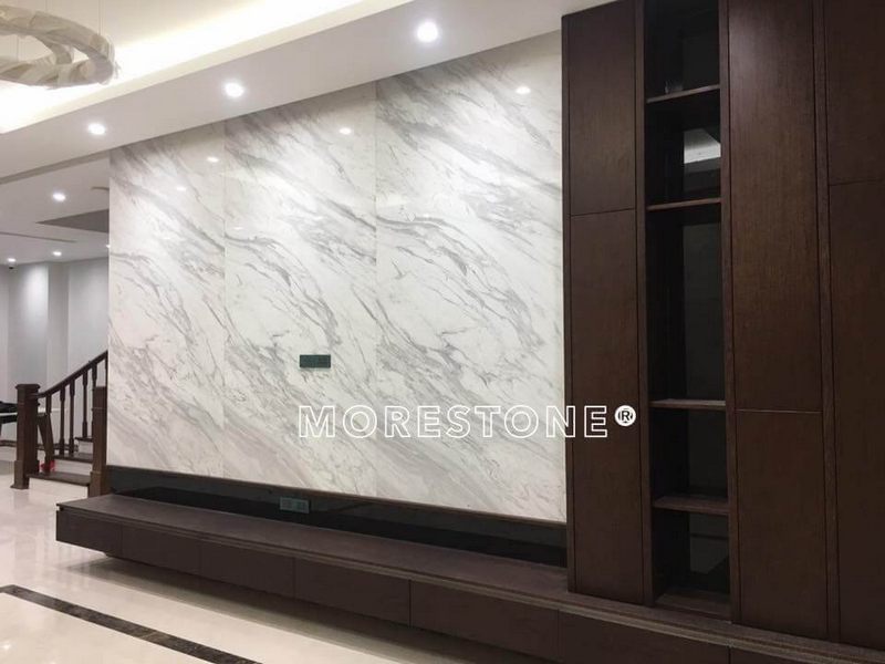 Đá ốp phòng khách trắng vân mây đẹp sang trọng lựa chọn ấn tượng cho phòng khách hiện đại.